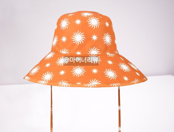 마지막으로, 영지가 함께 착용한 모자도 놓칠 수 없죠. 이 모자는 동일한 오렌지 컬러와 태양 패턴이 특징인 버킷햇 디자인으로, 데일리 모자로 착용하기에 안성맞춤입니다. 긴 챙 부분은 햇빛을 효과적으로 가려주어 야외 활동 시에도 유용합니다. 폴리에스터와 코튼 혼방 원단으로 만들어져 부드럽고 편안한 착용감을 제공합니다. 신축성도 좋아 머리에 딱 맞게 착용할 수 있으며, 물에 젖어도 쉽게 마르는 가벼운 소재라 여름철 바닷가나 수영장에서 유니크한 느낌을 연출하기 좋습니다.