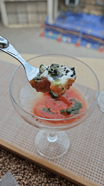 B코스는 10가지 요리로 구성되어 있고, 한 가지씩 천천히 즐길 수 있어요. 먼저 아뮤즈부쉬로 시작했는데, 트러플 미니슈, 초리조 타를릿, 카프리제가 나왔어요. 트러플 향이 가득한 미니슈와 신선한 초리조 타를릿, 상큼한 카프리제가 첫 시작을 멋지게 장식했어요. 정말 한 입 한 입이 행복했어요.