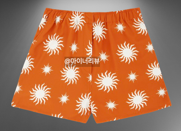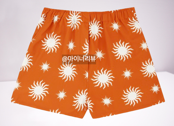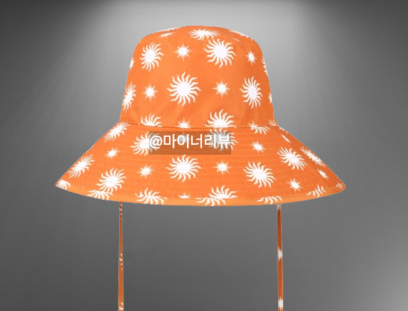 마지막으로, 영지가 함께 착용한 모자도 놓칠 수 없죠. 이 모자는 동일한 오렌지 컬러와 태양 패턴이 특징인 버킷햇 디자인으로, 데일리 모자로 착용하기에 안성맞춤입니다. 긴 챙 부분은 햇빛을 효과적으로 가려주어 야외 활동 시에도 유용합니다. 폴리에스터와 코튼 혼방 원단으로 만들어져 부드럽고 편안한 착용감을 제공합니다. 신축성도 좋아 머리에 딱 맞게 착용할 수 있으며, 물에 젖어도 쉽게 마르는 가벼운 소재라 여름철 바닷가나 수영장에서 유니크한 느낌을 연출하기 좋습니다.