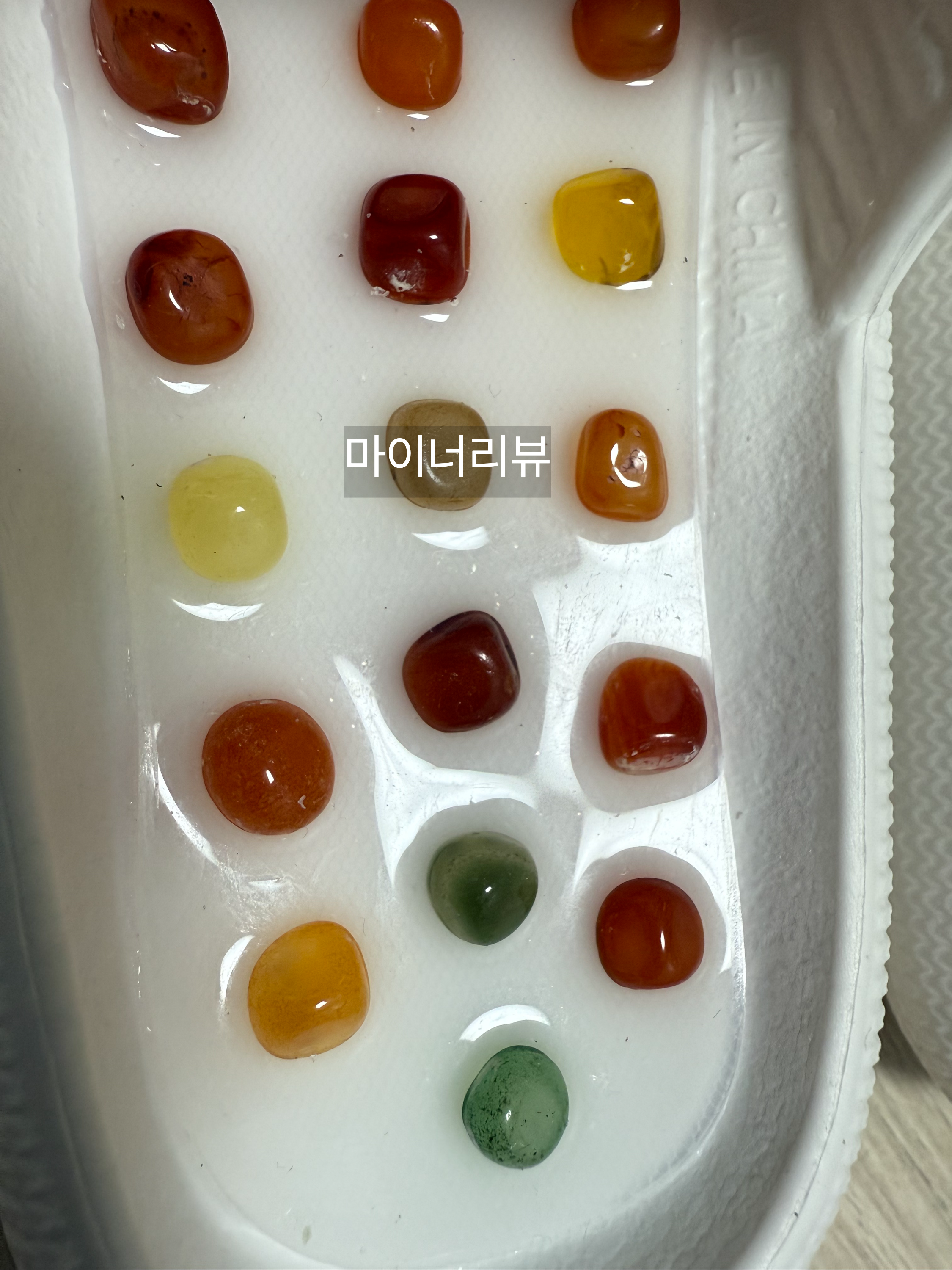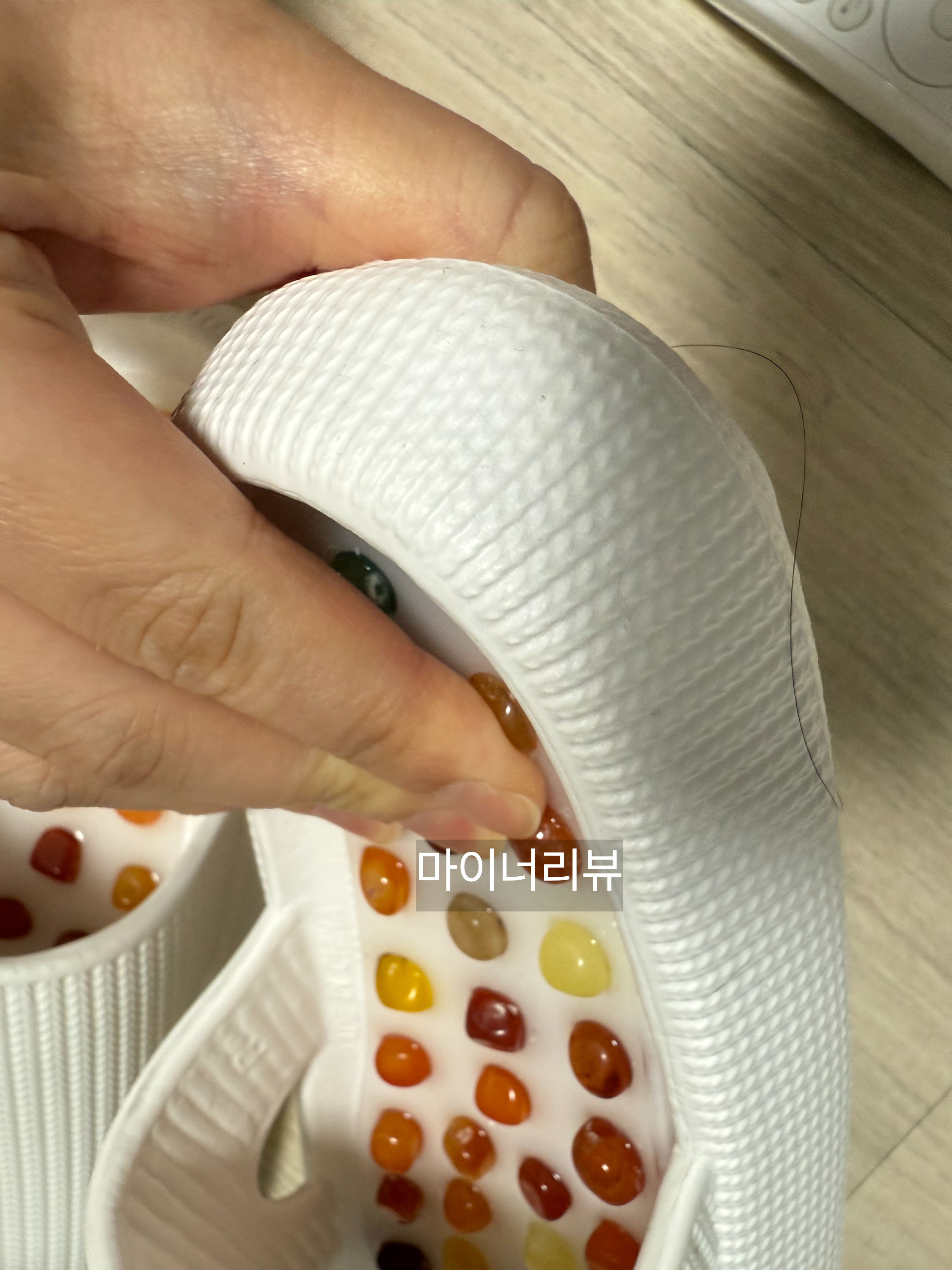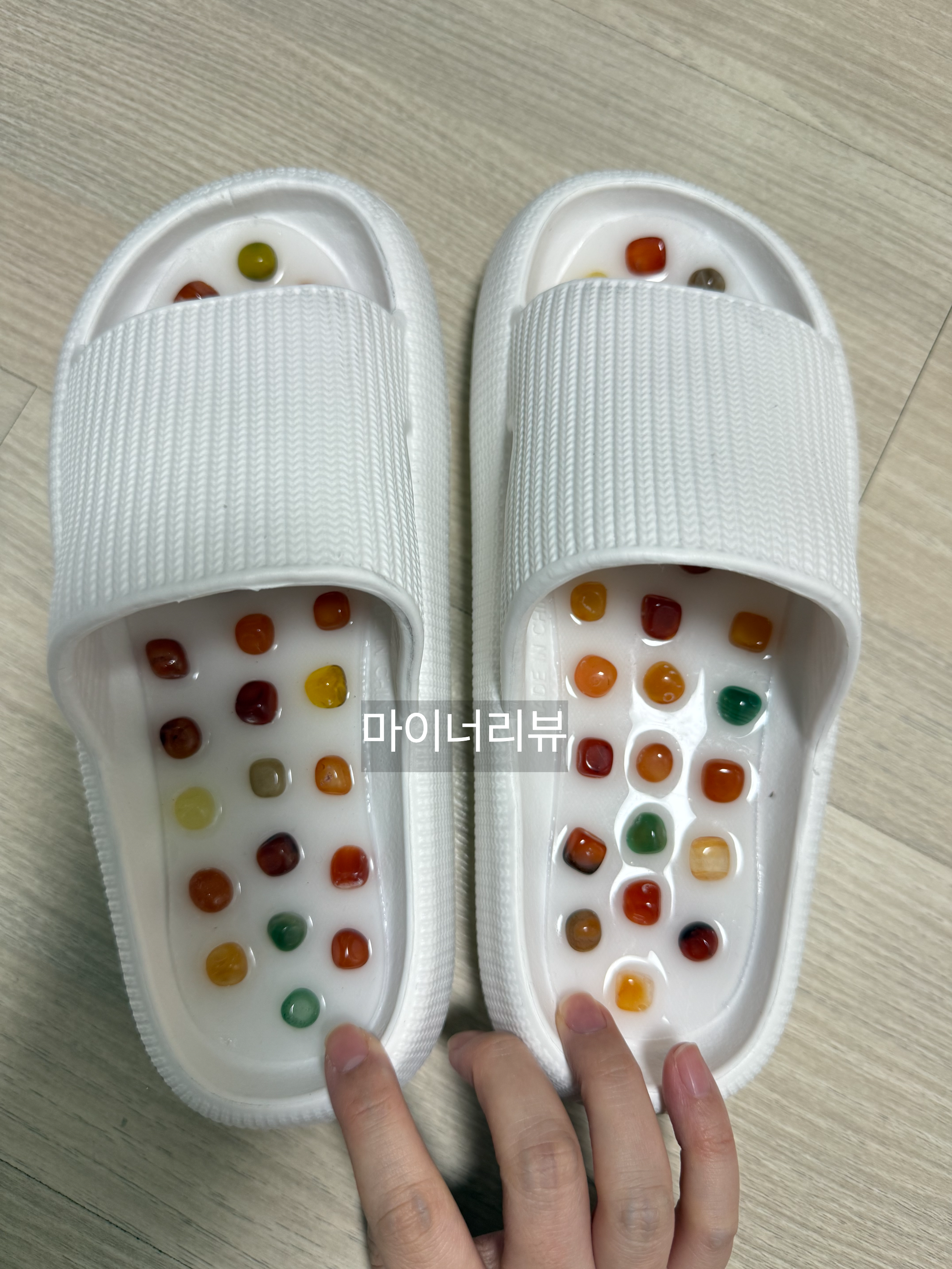 포장을 뜯고 보니 지압판이 알록달록하게 박혀 있어서 신기하게 생겼다는 생각이 들었다. 자세히 보니 플라스틱 돌기가 아니라 천연 마노석으로 만든 지압돌이 박혀 있어서 안심하고 신을 수 있을 것 같았다. 그리고 바닥 부분이 딱딱한 나무가 아니라 푹신한 EVA 소재라서 신고 걸어도 부담이 덜했다.